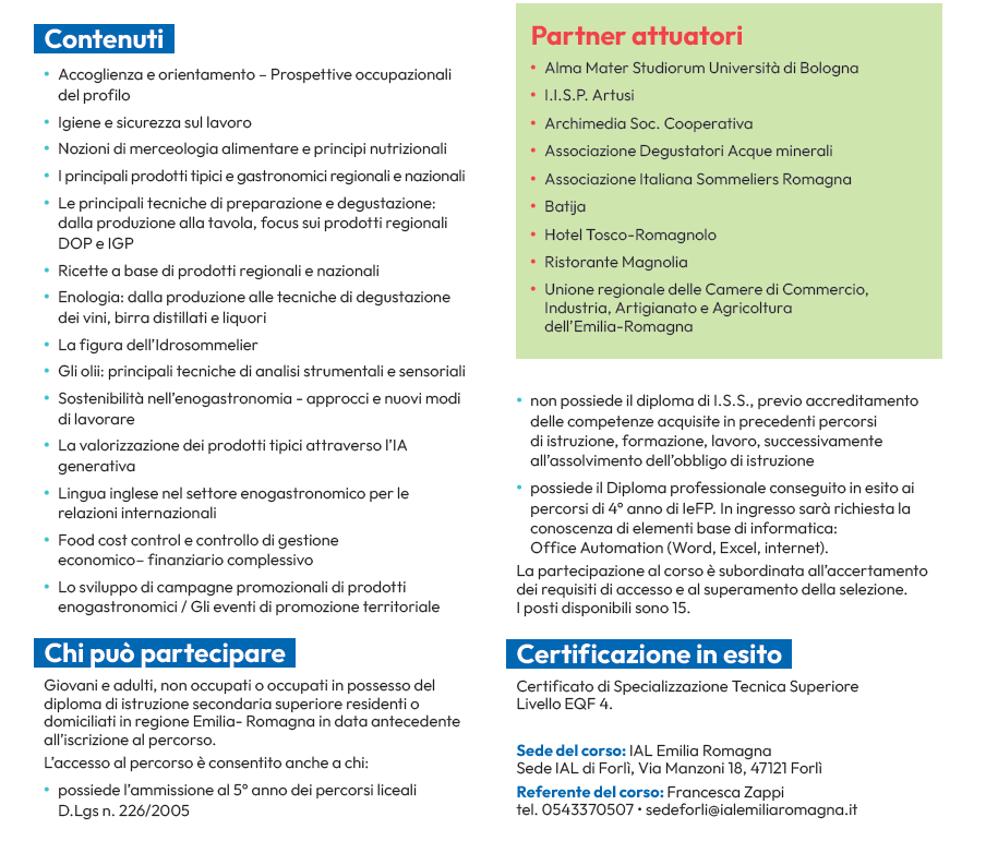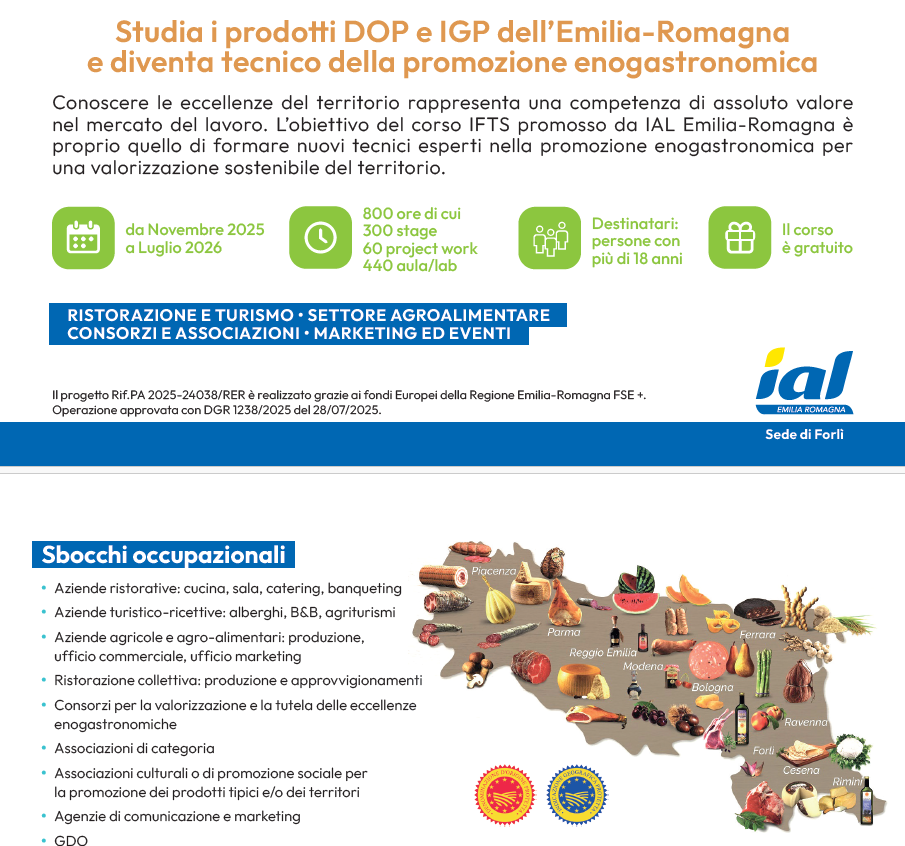 Il corso, che si svolgerà da novembre 2025 a luglio 2026 presso la sede IAL di Forlì, prevede 800 ore complessive (di cui 300 di stage, 60 di project work e 440 di attività in aula e laboratorio) ed è gratuito. È destinato a persone maggiorenni con interesse verso la valorizzazione e la promozione enogastronomica del territorio.